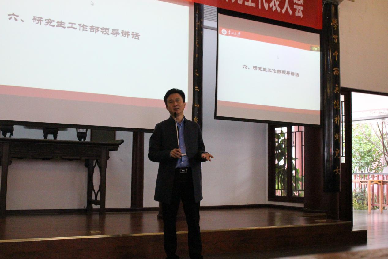 首先,由文学与传媒学院党委书记罗卫刚致开幕词。在致辞中,罗书记对即将产生的新一届学生组织应当如何开展工作提出了三点建议。一是要加强思想引领,将思想建设与组织开展丰富的研究生生活有机结合起来;二是要维护学生的正当利益,充分发挥好委员会在学校、学院以及学生之间的桥梁和纽带作用;三是要密切与同学的联系,加强与研究生党支部、研究生班级和研究生团支部的联系,以实现资源共享和工作效率的最大化。