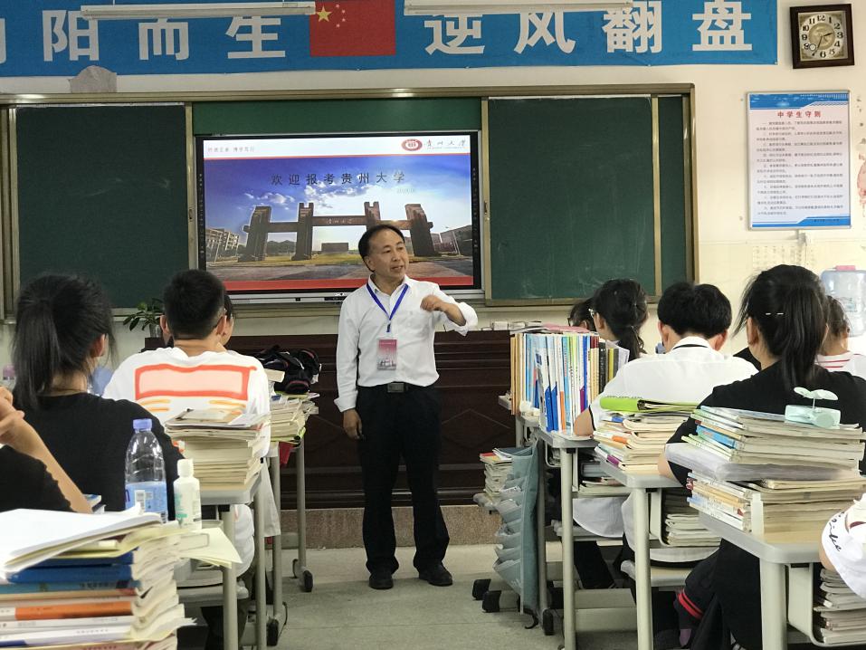6月21日下午2:30,遵义市第二十一中学高三28班教室人满为患,李开学从学校概况、学科发展、招生计划、学生培养及培养成果5个方面进行宣讲。并对学生的专业选择、分数线划定、国内外交流机会、升学就业方向等提问进行了详尽而细致的解答。通过宣讲及提问,前来聆听宣讲的学生对于贵州大学有了详细的了解,并对贵大的招生要求也有了明确的掌握。
