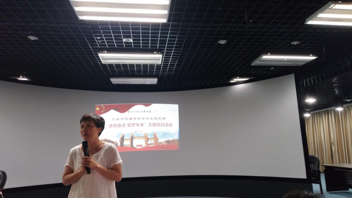 6月27日下午14:30,文学与传媒学院2019届毕业生“感恩奋进筑梦未来”主题党日活动于贵州大学东校区慎思楼情景模拟室举行。文学与传媒学院党委副书记董蔚然、学生科王婷婷出席活动,文学与传媒学院本科生党支部全体党员、发展对象、入党积极分子参加活动。活动分为毕业生党员主题分享、毕业生党员寄语、支部党员重温入党誓词以及领导讲话四个部分。
