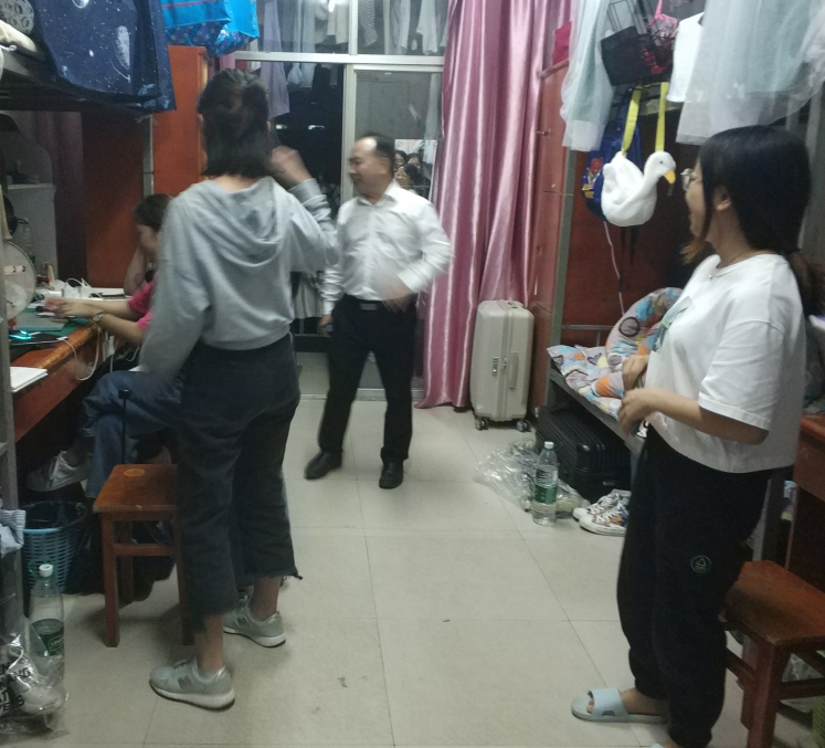 9月6日晚上8:30,院党委书记李开学、副书记董蔚然、学生科辅导员曹家鹏以及学生干部对2019级本科生宿舍进行走访。院领导和辅导员对同学们日常生活进行进一步了解,询问同学们加入学院的学习与生活情况,耐心回答同学们提出的各种问题。同时,对宿舍卫生与安全方面提出了要求,督促同学们共同营造良好的学习生活环境。