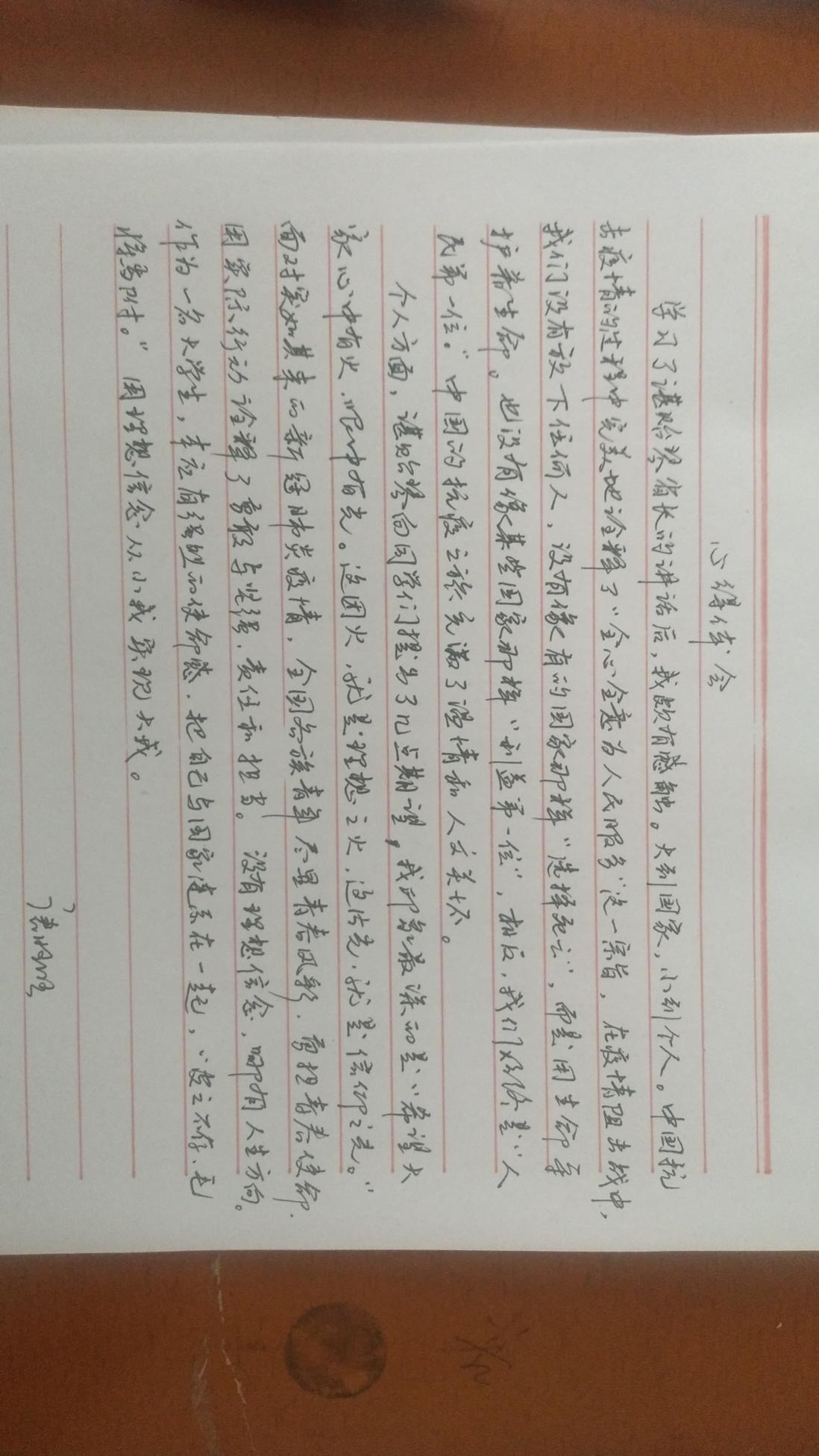 听完此次的讲话,内心深有感触。对于我而言,今年农历新年是最印象深刻的一个新年。自武汉封城开始,全国人民都开始陷入紧张情绪之中,我也开始意识到疫情的严重性远超想象。但是我们全国人民万众一心的抗疫决心,把我对这场疫情的悲观预测牢牢压制住了。国家对于这场瘟疫闪电般的行动,国家层面对于全国疫情发展的控制,中央对于各省市物资的调动,各省对于湖北的一对一对口支援,新年期间医疗物资工厂不分昼夜的生产以及湖北人民决绝的抗疫决心,让我确切的感受到了中国的强大,中华民族的团结以及中国人民的无畏。在疫情期间,无数中华儿女的无私奉献让我落泪,我看到了我们这个民族,我们的乐观,我们的强大,我们的豁达,是任何困难都打不垮的,相比于其他国家疫情的发展,我由衷为我是一名中国人而感到自豪。作为青年大学生,我也不断思索,能够为这次疫情做些什么。力量甚小,则先以立身。自己不四处走动,出门勤洗手、戴口罩,回学校遵守相关规定,尽管疫情已有所缓解,但仍不能松懈。我要把眼前的学业做好,争取早日在社会中真正贡献自己的力量。