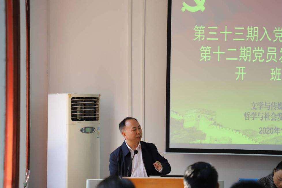 2020年10月23日中午,文学与传媒学院及哲学与社会发展学院于人文楼308举办了第十二期党员发展对象培训班暨第三十三期入党积极分子培训班开班仪式。文学与传媒学院党委书记李开学、哲学与社会发展学院党委书记周乐成、文学与传媒学院党委副书记董蔚然、哲学与社会发展学院学生辅导员晏梦勋出席开班仪式,会议由文学与传媒学院党委组织员兼本期培训班班主任姬丹主持,文学与传媒学院及哲学与社会发展学院培训班全体学员参加会议。