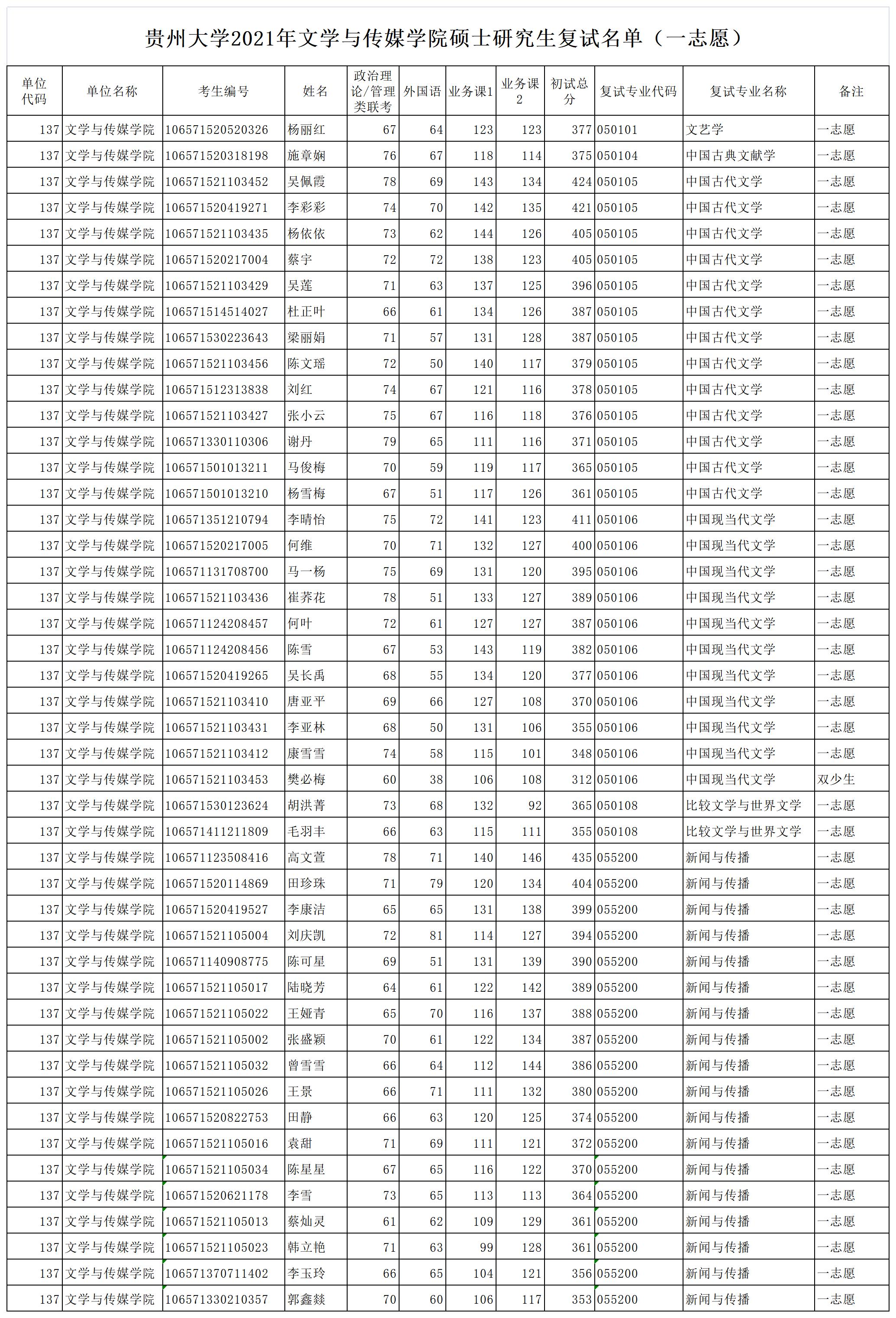 贵州大学2021年文学与传媒学院硕士研究生复试名单(一志愿)
