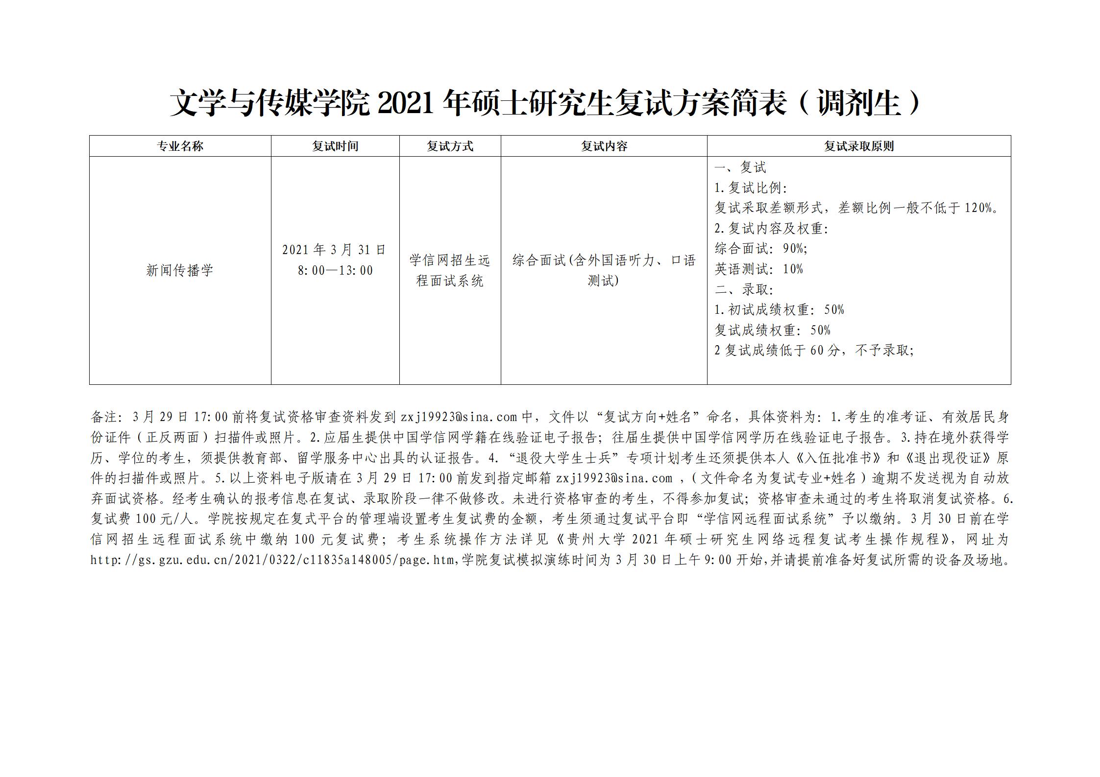 文学与传媒学院2021年硕士研究生复试方案简表(调剂生)