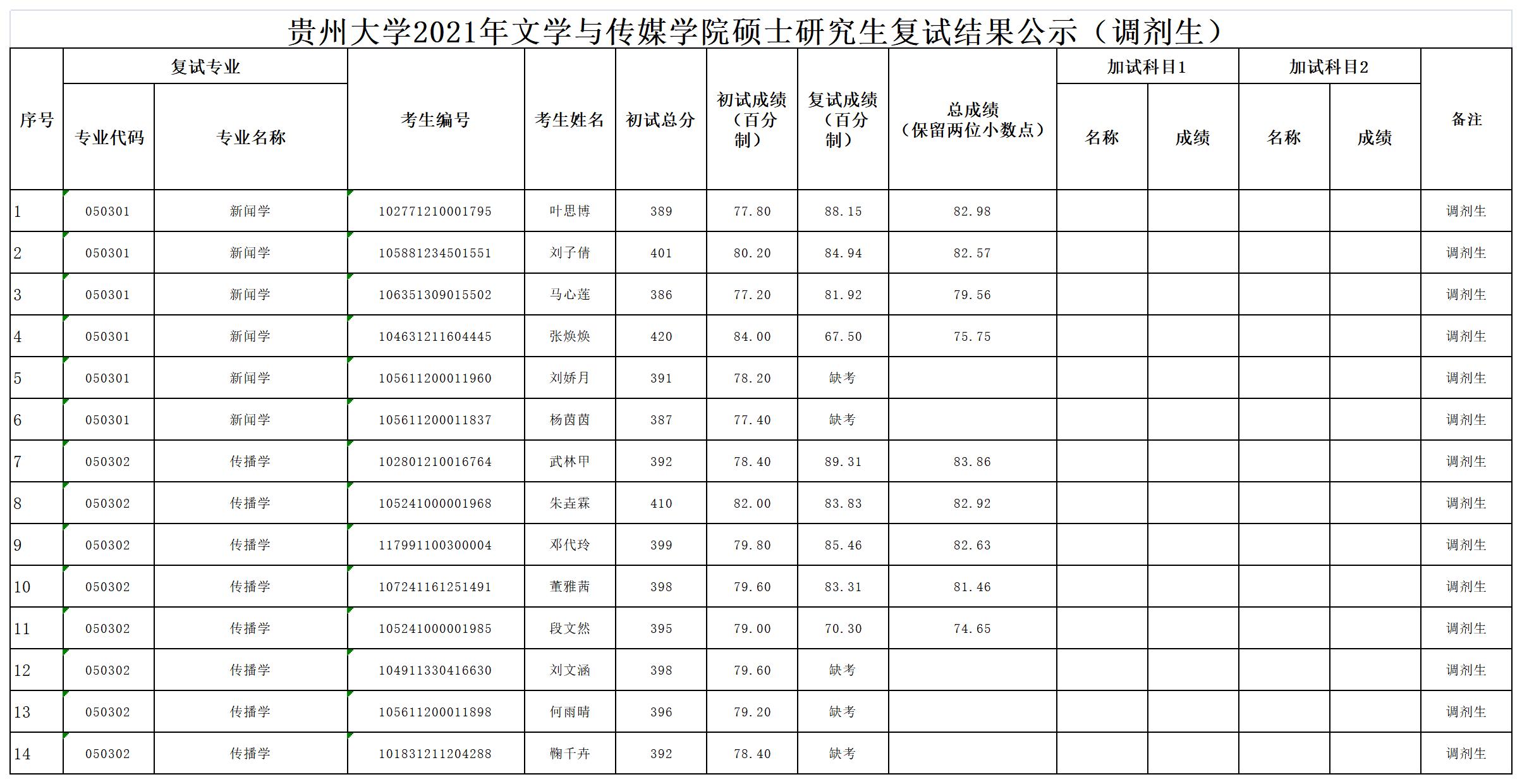 贵州大学2021年文学与传媒学院硕士研究生复试结果公示(调剂生)