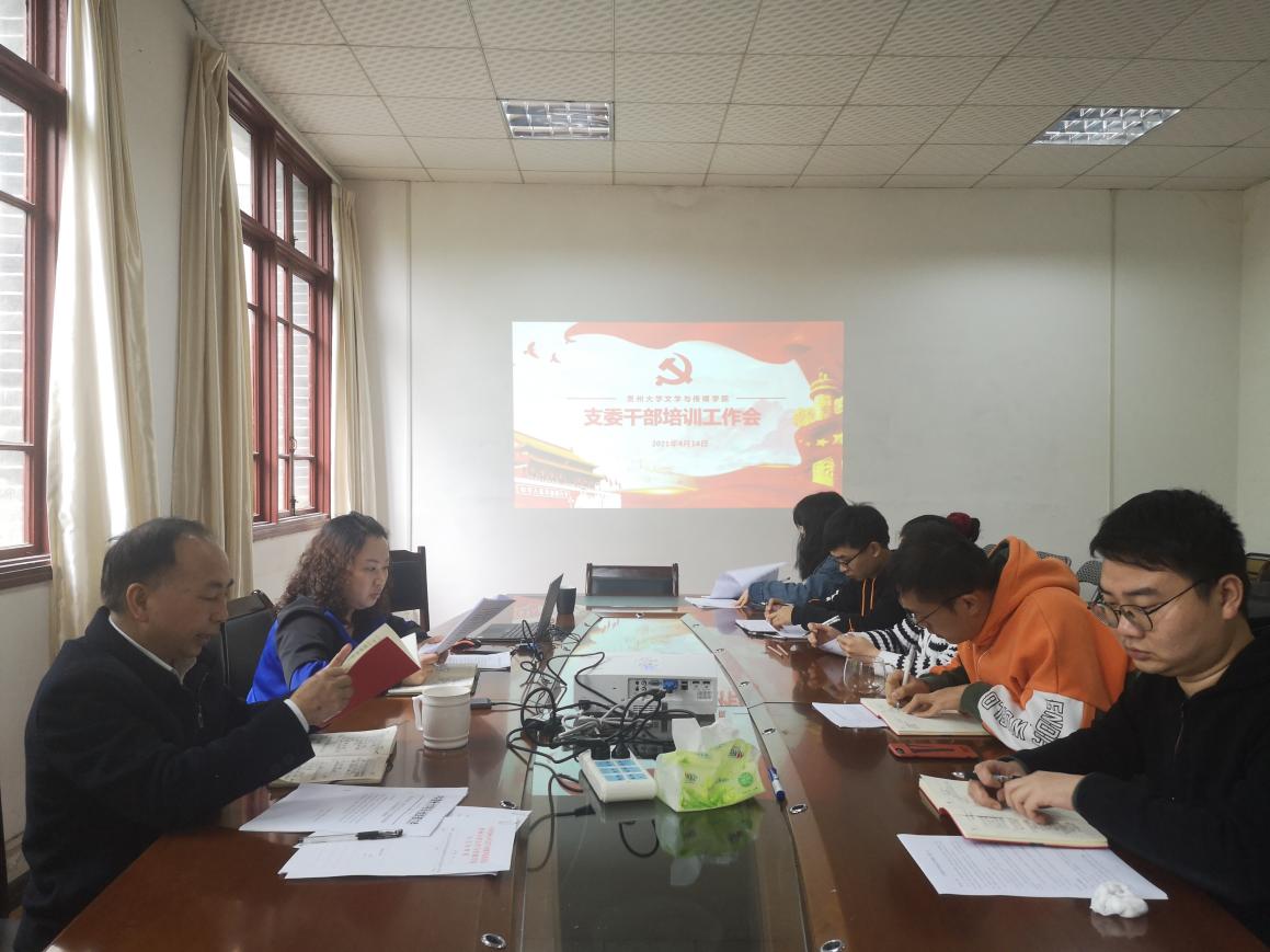 4月14日下午,贵州大学文学与传媒学院在人文楼204召开第二轮支委干部培训工作会,各党支部书记、支委成员参加了会议,培训工作会由院党委委员、组织员姬丹主持,院党委书记李开学出席讲话。