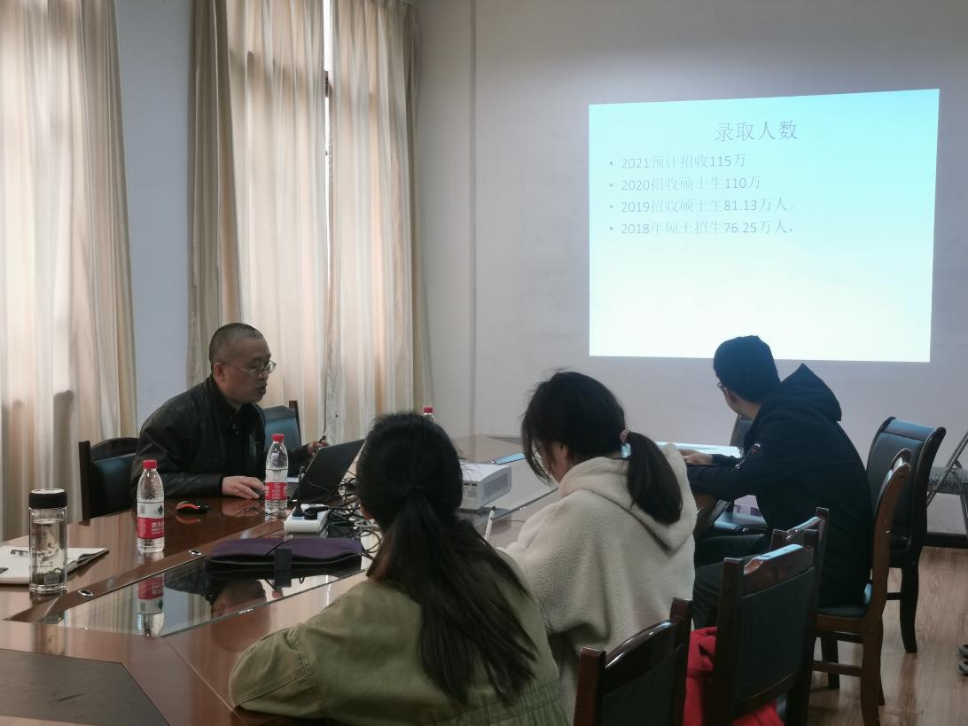 与会老师为同学们分享了自己的考研经验,并强调:第一,学生要明确考研方向,了解自己想要学习和从事的领域;第二,要从自己的实际出发,选好考研第一志愿,选择适合自己的学校以及专业;第三,要做好充分准备,重视英语及基础理论知识的学习;第四,要树立信心,坚持到底;第五,要懂得利用政策优势,积极与老师进行学习交流。