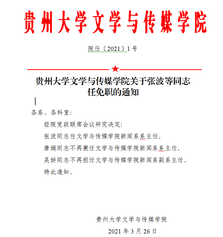贵州大学文学与传媒学院关于张波等同志任免职的通知