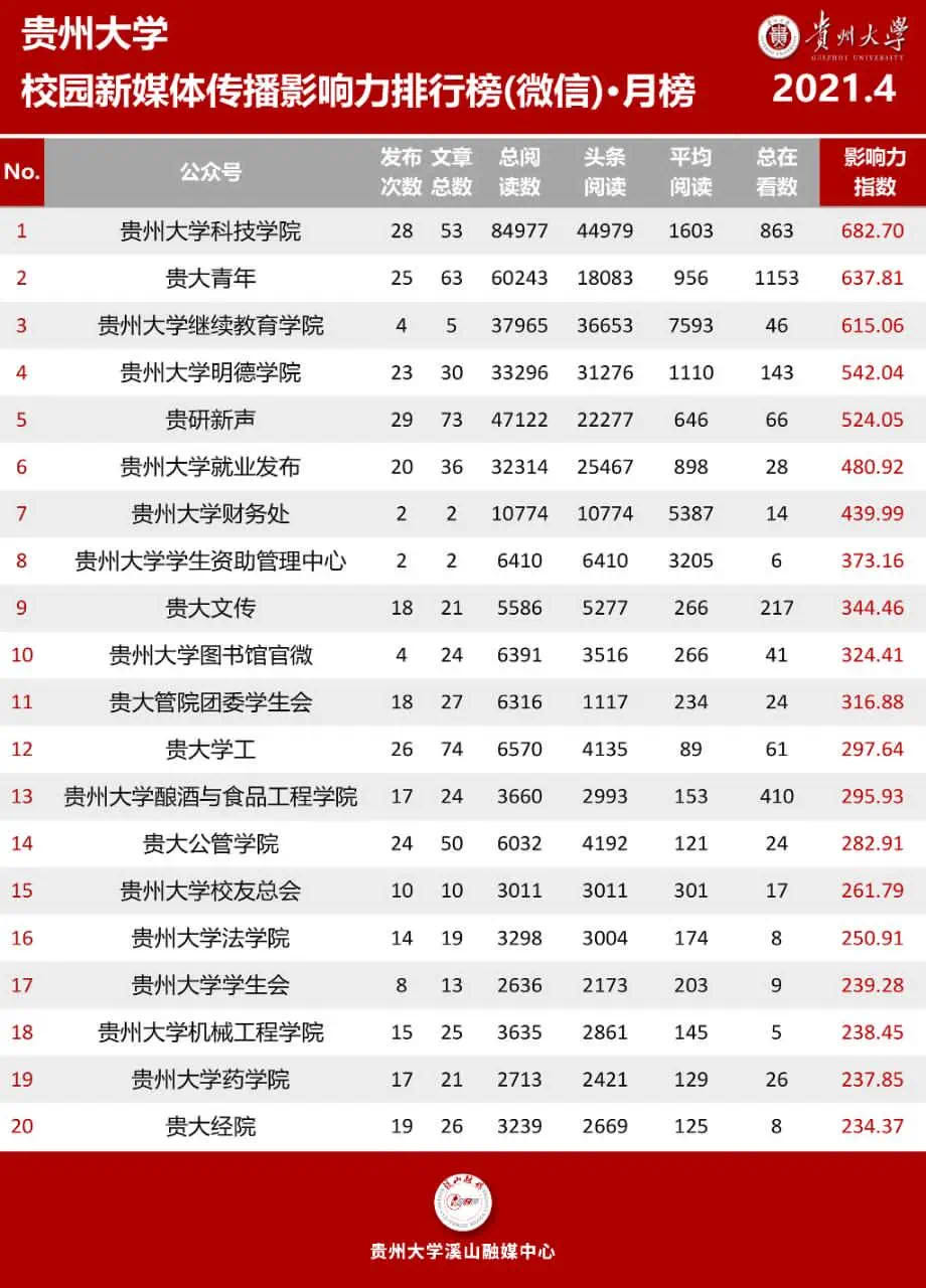 经统计,从2020年11月11日至2021年5月11日,工作室运营的“贵大文传”公众号累计关注人数从1344人增长到了1554,共增210人,常读用户数为367,比例为24%,常读数量也在不断增长,4月份“贵大文传”公众号在校园新媒体传播影响力排行榜中排名前十!