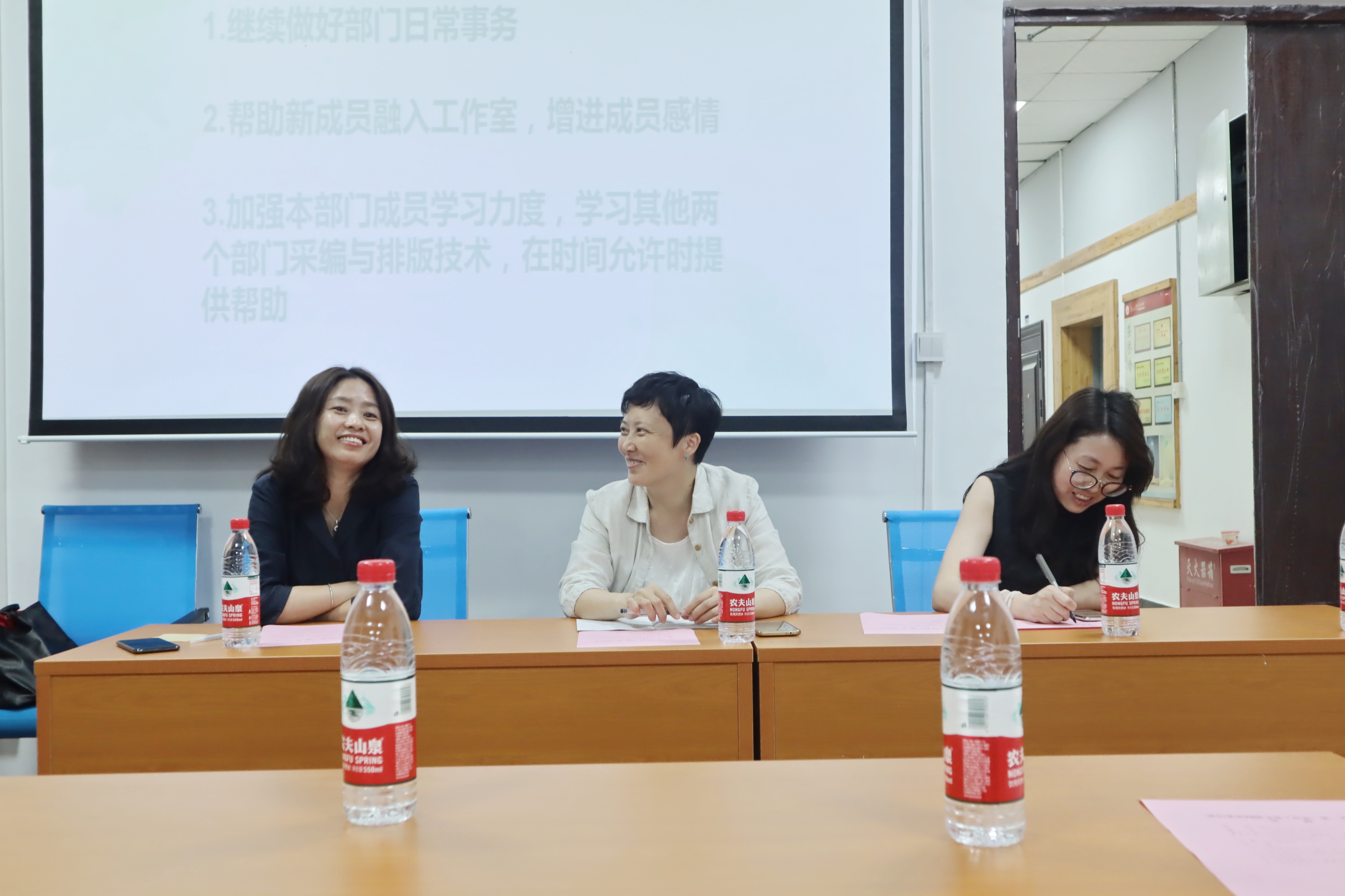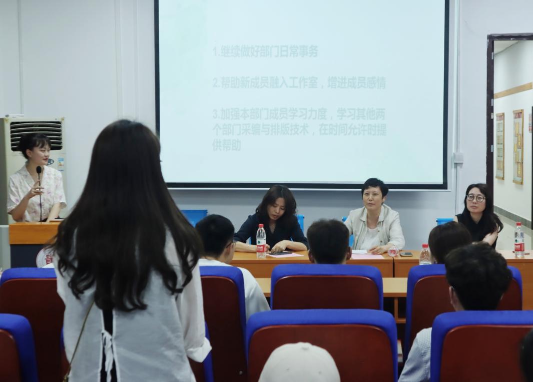 采编部部长叶鑫、新媒体部部长蒙怡彤以及综合部部长乔硕上台发言。三位部长分别从推文数量、公众号运营和工作自评三个方面回顾了工作室发展情况,同时针对各自部门存在的问题进行总结归纳,并寻求老师们的指导,希望能让工作室“从新出发”,更上一层楼。