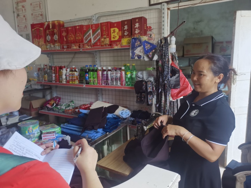 在村内乡村电商O2O村级服务点,队员与商户交谈,了解当地电商和布依服饰工艺和电商网点经营情况。在返乡创业青年夫妻的手工衣坊,队员详细了解了布依族传统布料染色、缝纫技艺和电商平台推广的情况。
