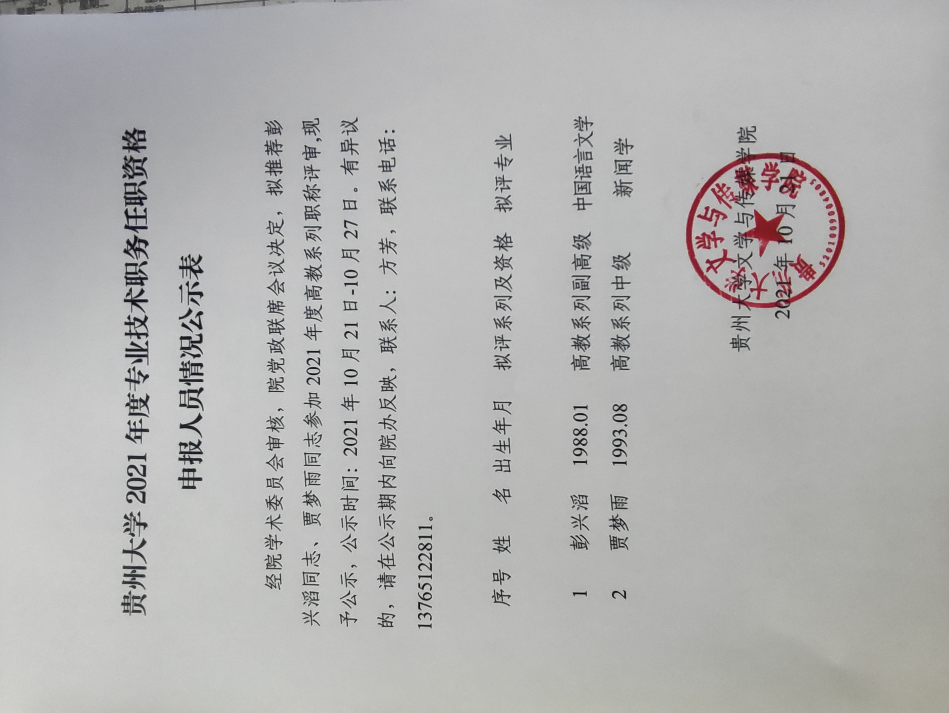 贵州大学2021年度专业技术职务任职资格申报人员情况公示表
