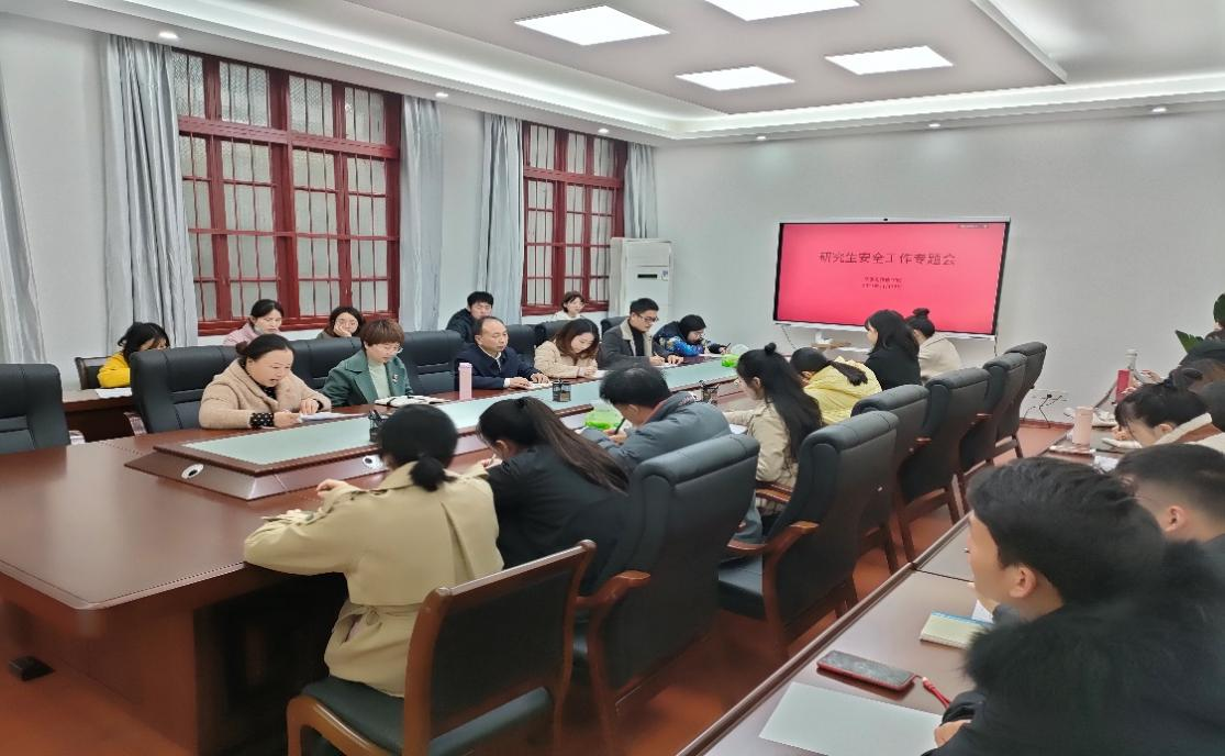 为提高学生的安全防范意识,确保学生生命安全和身体健康,文学与传媒学院于2021年11月12日下午在人文楼104会议室召开研究生安全工作专题会议,书记李开学、副书记、副院长唐娟出席会议并讲话。会议由文学与传媒学院研究生思想政治辅导员姬丹主持,全体研究生班长参加了会议。