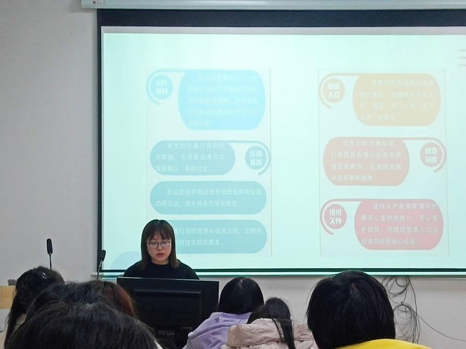 王婷婷强调,各班团干部一定要明确自己的工作职责,带头学习党团的各项方针政策,传达党组织和上级团组织的工作精神,主动关心支部团员青年的成长进步,组织开展好各项活动。各院团干部提高思想认识,提高服务本领,熟练使用、运营好青年大学习,智慧团建、到梦空间等网络学习平台,监督各团支部青年大学习网上主题团课学习情况,帮助各团支部开展团组织生活,严格做好团组织生活评比、团员团组织关系转接、推优入党等工作。
