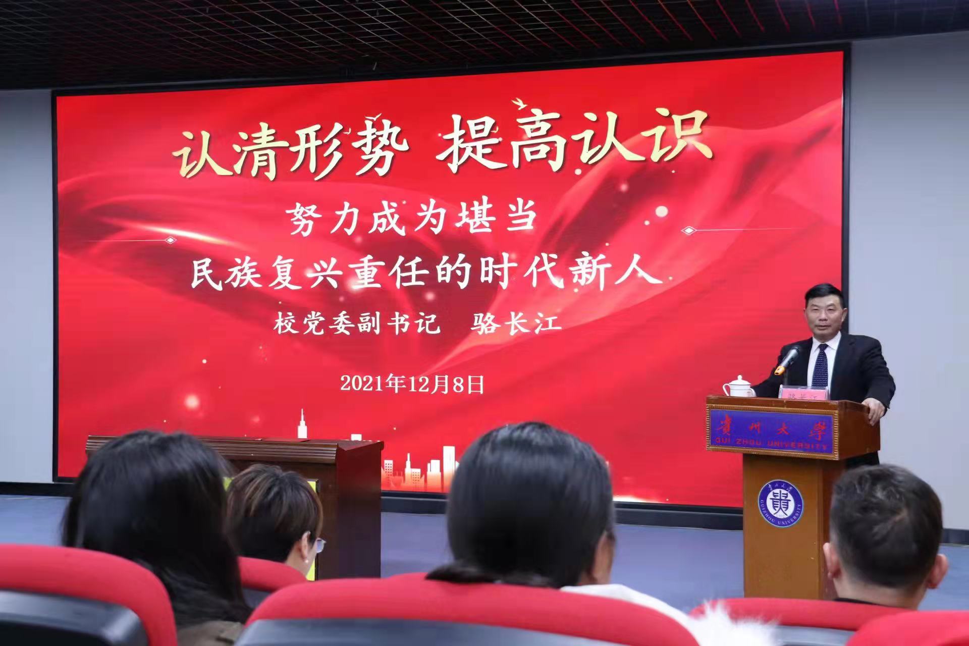 12月8日下午,校党委副书记骆长江到文学与传媒学院为学生讲授思政理论课。骆长江的授课主题为“认清形势,提高认识 ,努力成为堪当民族复兴重任的时代新人”。