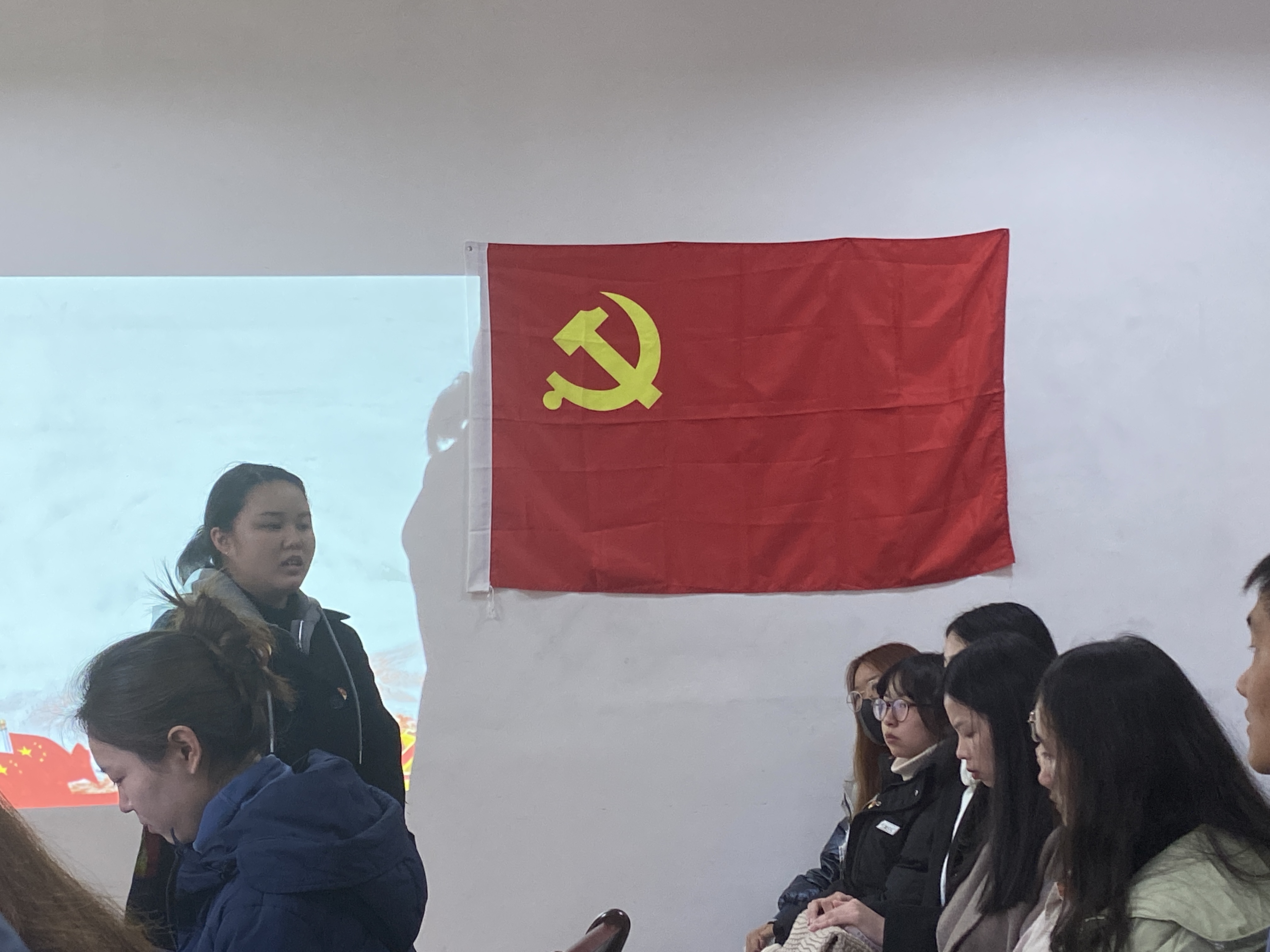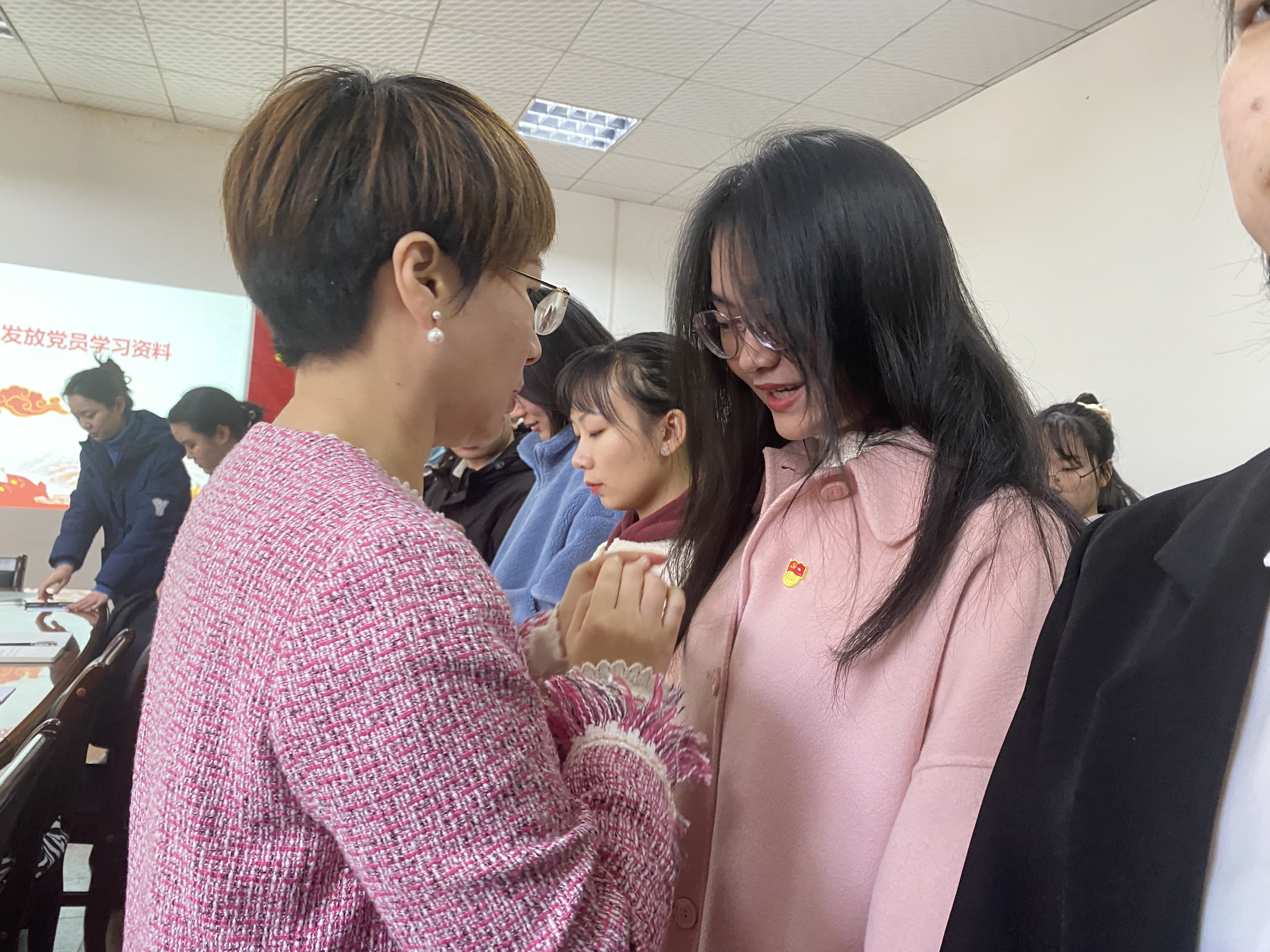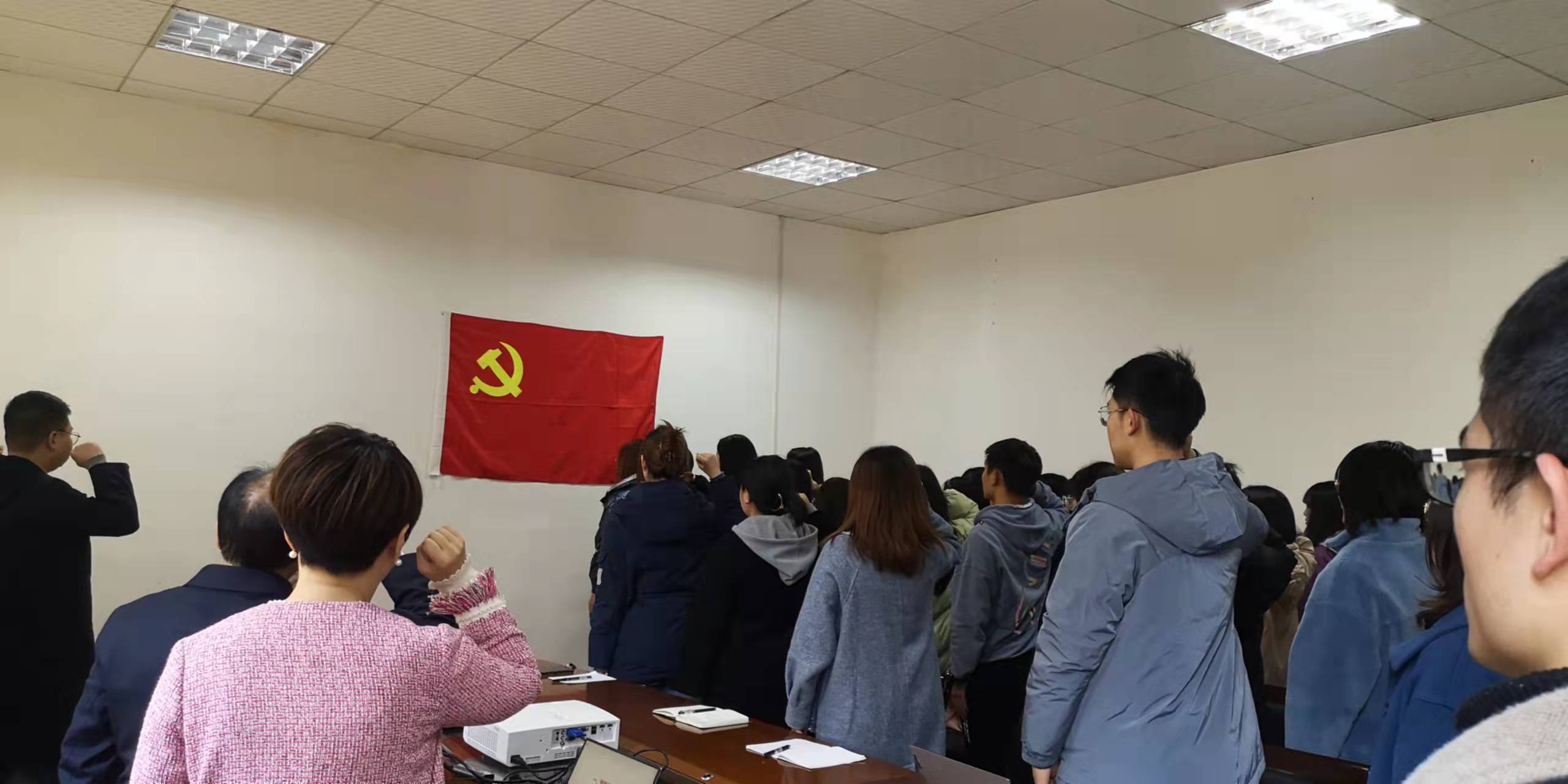 42名预备党员面向党旗,举起右手,在领誓人方芳的带领下庄严肃穆地面向党旗宣誓,用铮铮誓言向党表达忠诚和为共产主义事业奋斗终身的决心。唐娟、方芳、姬丹随后为预备党员们佩戴党徽,并发放党员学习资料。