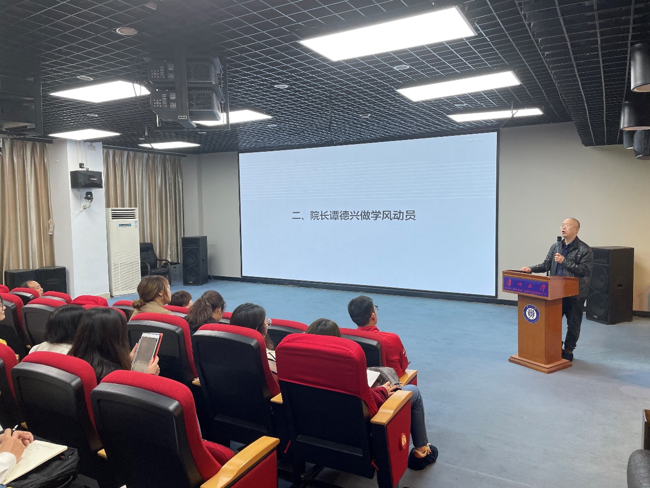 接着,谭德兴院长为我院研究生做学风动员。他认为,我院研究生重心应该放在学业上面,在读期间应戒图享乐、拒绝懒散,应树立远大理想、确立宏伟志向,强化自身素质、夯实专业基础。劝诫同学们端正学习态度、培养良好的学习习惯、创造积极主动的学习氛围。