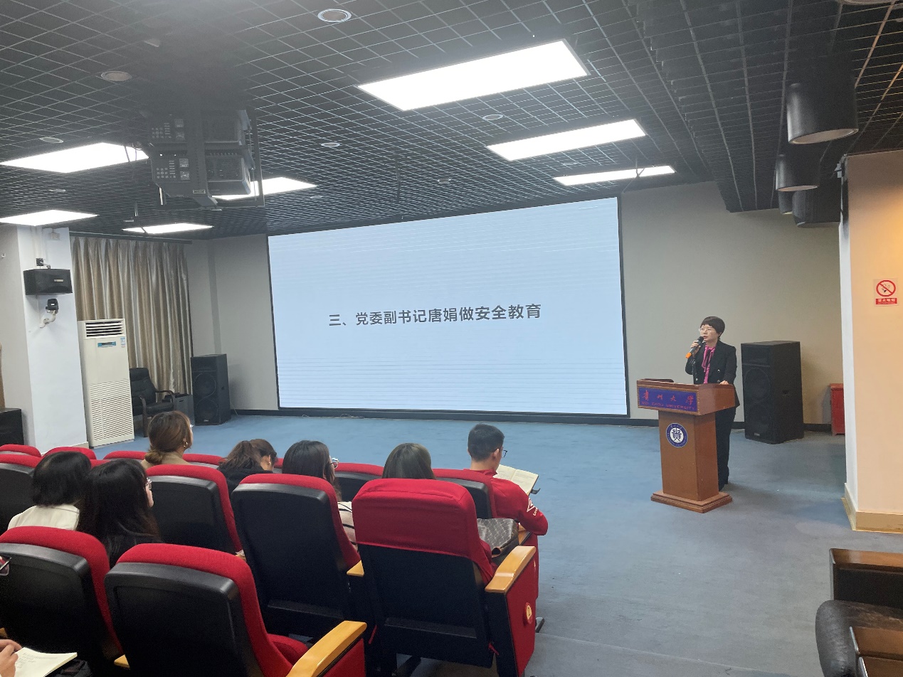 随后,学院党委副书记、副院长唐娟为同学们做安全教育。针对近期严峻的疫情形势,提出以下防控提示,一是要做好自我防护,勤洗手,少聚集;二是学校即将进行封闭管理非必要不出校;三是要积极配合学校分批次进行全员核酸检测的工作;四是新冠疫苗接种应做到应接尽接,达到时间要求的可以按照学校的统一安排接种加强针。针对校园安全稳定方面,唐娟提醒同学们在校期间要做到安全用水、安全用电,注意防盗、防溺水、防诈骗,注意自身及周边同学的心理健康,同时,应认真学习学校关于校园规范用车的相关文件要求,做到安全用车,创建文明校园。