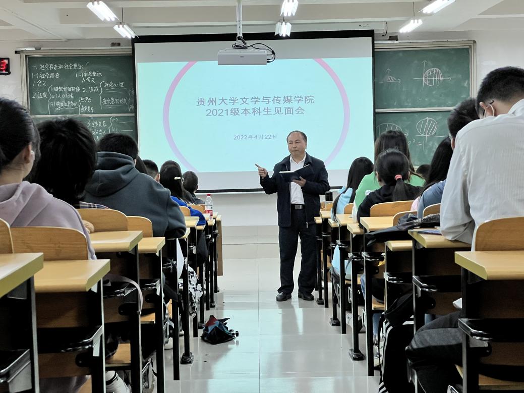2022年4月22日下午,文学与传媒学院赴阳明学院在南校区致知楼102举行汉语言文学专业、新闻学专业2021级本科生见面会,学院党委书记李开学、副书记院长谭德兴、副院长赵永刚、学生科思政辅导员张健参加见面会。会议由文传学院学生科科长王婷婷主持。