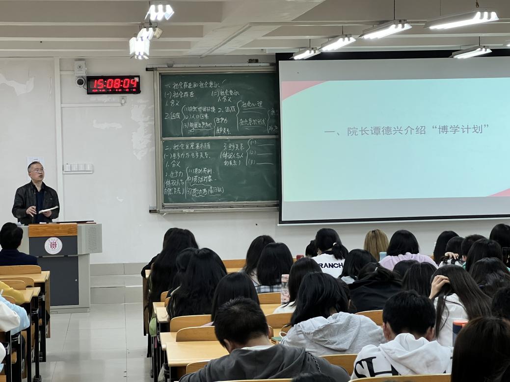 谭德兴对我院“博学计划”所取得的成就和效果进行了介绍。他指出学院为深入推进“博学计划”而设置“博学班”始设于2018级,目的是纠正学风、营造良好的学习氛围,从2022届毕业生的升学情况来看,“博学班”的设置以及“博学计划”的深入推进切实改进了整个学院的学风,培养效果取得了质的改善。为此,他强调了学习的重要性,希望同学们从此刻开始就应该树立远大的目标,能够端正学习态度,明确学习方向,养成良好的学习习惯,不断提升学习动力和专业兴趣。