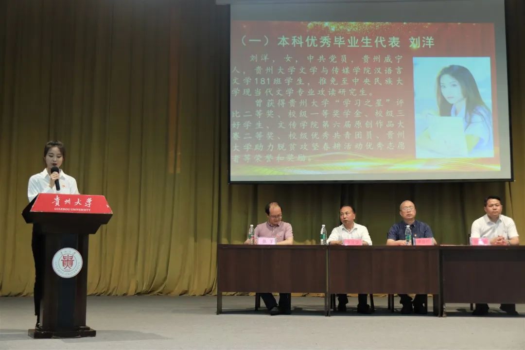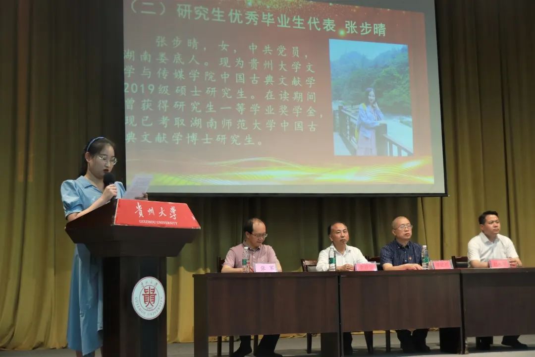 2019级中国古典文献学研究生张步晴同学代表研究生发言。她对学院的教导与栽培表示感谢,并向有志于继续升学、深造的文传学子分享其感悟与经验。她表示,同学们应具有准确、清晰的规划,怀有坚定信念,同时更需付出实际行动。最后,她对广大2022届毕业生、学院老师、贵州大学送上真挚祝愿。