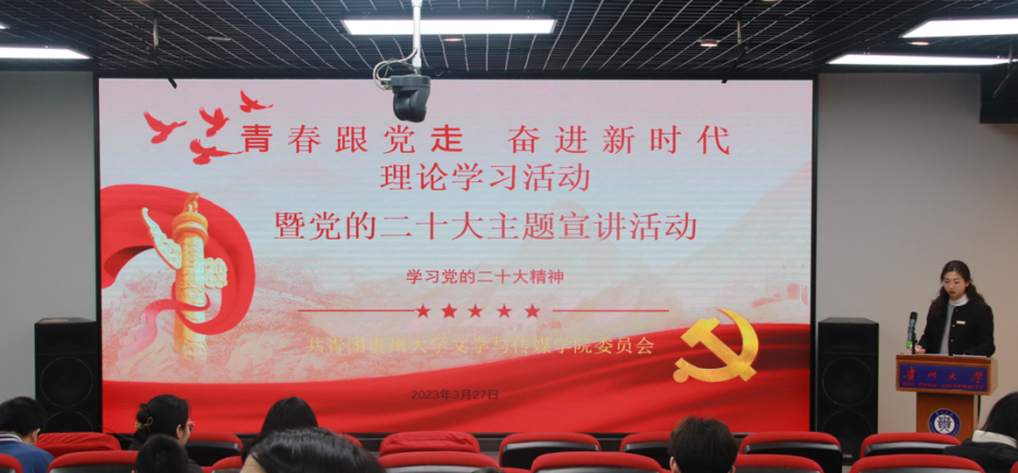 2023年3月27日下午,共青团贵州大学文学与传媒学院委员会于慎思楼情景模拟实验室开展了第一次“青春跟党走•奋进新时代”理论学习活动。该活动是在院党委的领导下,由院团委面向学院青年团干和团员推出的特色理论学习活动之一。文学与传媒学院全体团学干部及本科生青年代表参与本次活动,活动由院团委宣传部副部长袁艺主持。