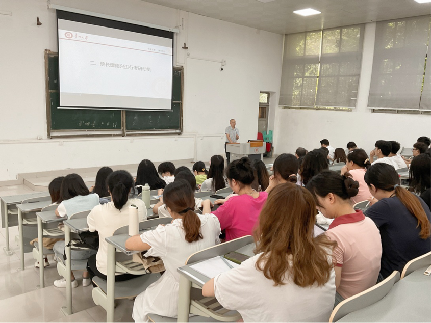 谭德兴进行考研动员。他强调:一、同学们要有克服一切困难的决心,考研是一场持久战,行百里者半九十,希望同学们能够带着韧劲坚持到考研的最后一刻。二、同学们要有一战上岸的信心,学会充分利用好学校、学院提供的复习条件,积极参与强基课程。三、同学们在复习过程中一定要细心,要学会精准找出复习中出现的问题,并有针对性地解决,提醒同学们要抓住时间、高效学习,在复习备考的道路上踏实前进。