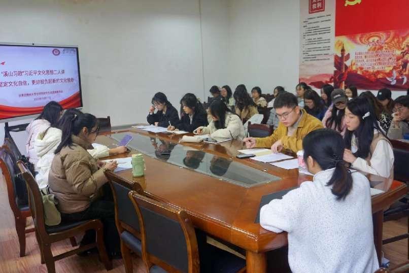 2023年11月17日,共青团贵州大学ledong乐动(中国)体育官方网站研究生总支部委员会在人文楼204会议室组织开展了“溪山习政”习近平文化思想及相关内容的学习与讨论。2023级全体研究生参加此次学习,会议由ledong乐动(中国)体育官方网站团总支副书记吴先兰主持。