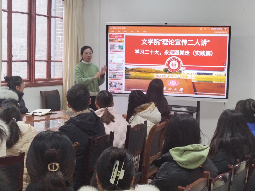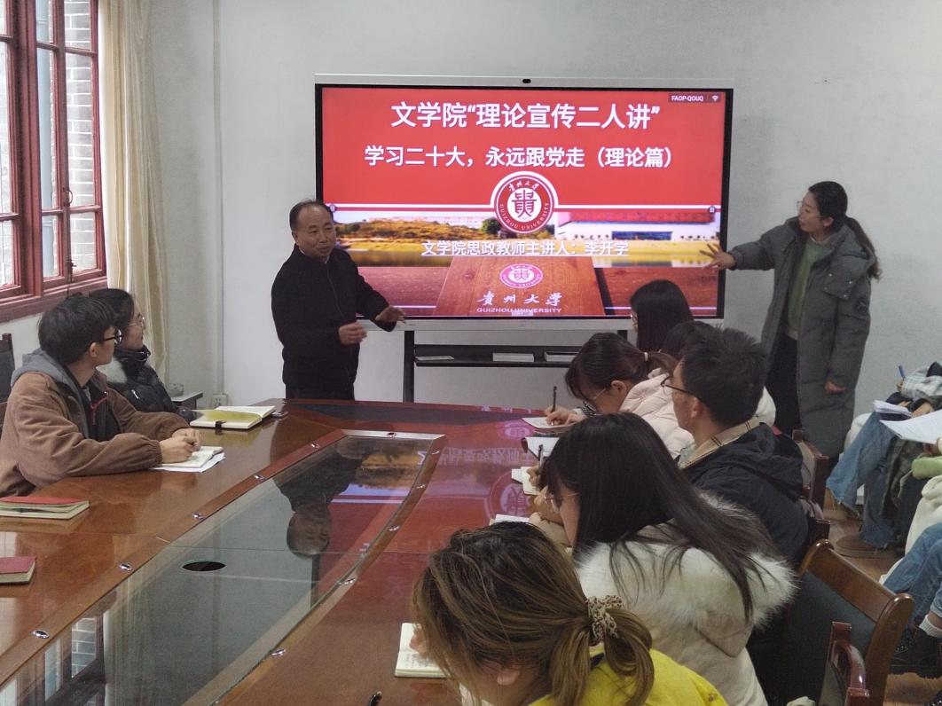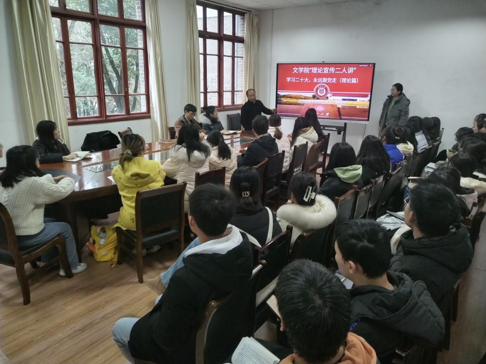 根据校党委2023年9月8日印发的《关于在全校开展新时代党的创新理论“理论宣传二人讲”宣讲的通知》,为促进我院学子深入了解新时代党的创新理论,ledong乐动(中国)体育官方网站思政课教师主讲人李开学和学生主讲人袁艺于2023年12月21日在人文楼204会议室,面向汉语2101班全体同学进行理论宣讲。