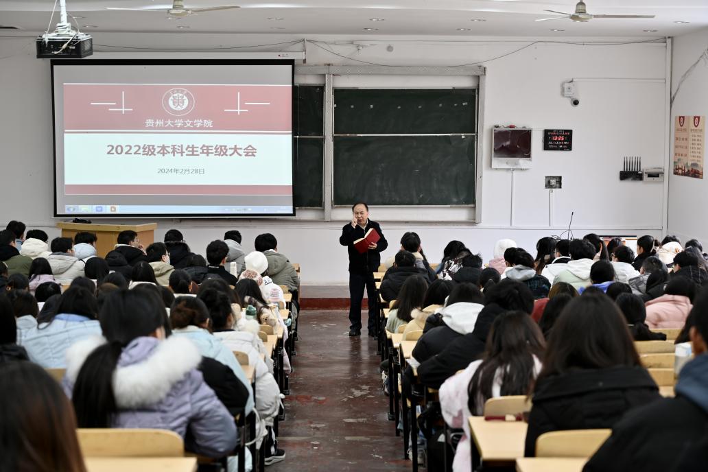 2023年2月28日中午,贵州大学ledong乐动(中国)体育官方网站在逸夫楼515DT召开2022级本科生新学期年级大会。学院党委书记李开学、本科生思政辅导员曹家鹏及全体2022级本科生参加会议。会议由曹家鹏主持。
