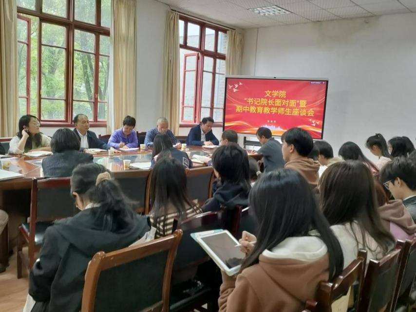 为进一步推进学院教风学风建设,5月17日下午,贵州大学文学院“书记院长面对面”暨期中教育教学师生座谈会于人文楼204召开。校督导组老师张成霞、学院党委书记李开学、党委副书记院长谭德兴出席,院督导组老师李青、张丽萍及教师代表,各班团支部书记、班长、学习委员及学生代表共40余人参加会议。会议由党委副书记副院长赵永刚主持。