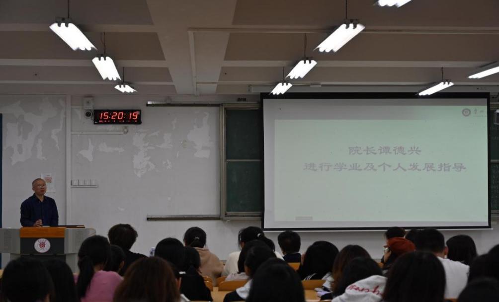 谭德兴进行学业及个人发展指导。他针对汉语言文学学生学习现状、学习任务和学习要求三方面做了讲述,他表示一、同学们要树立明确的学习目标,找回学习初心,对未来做好规划,以目标为动力。二、大学学习需要增强主动性,摆脱被动学习思维,转变学习方法三、要积极参加创新比赛多参与科研,通过多读、多记、多思、写、多交流,提升专业能力及综合素质,达到能记、能写、能的学习目标