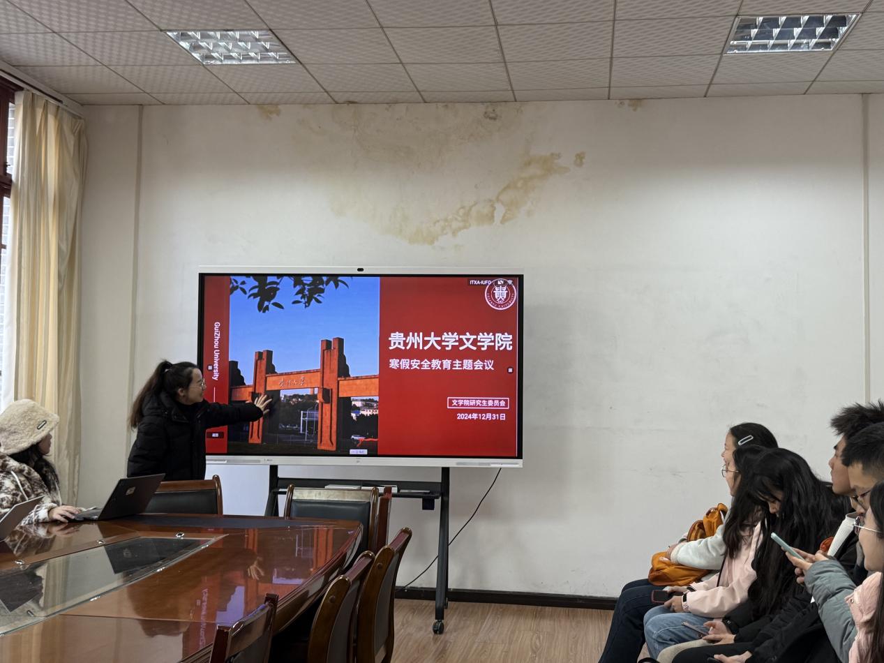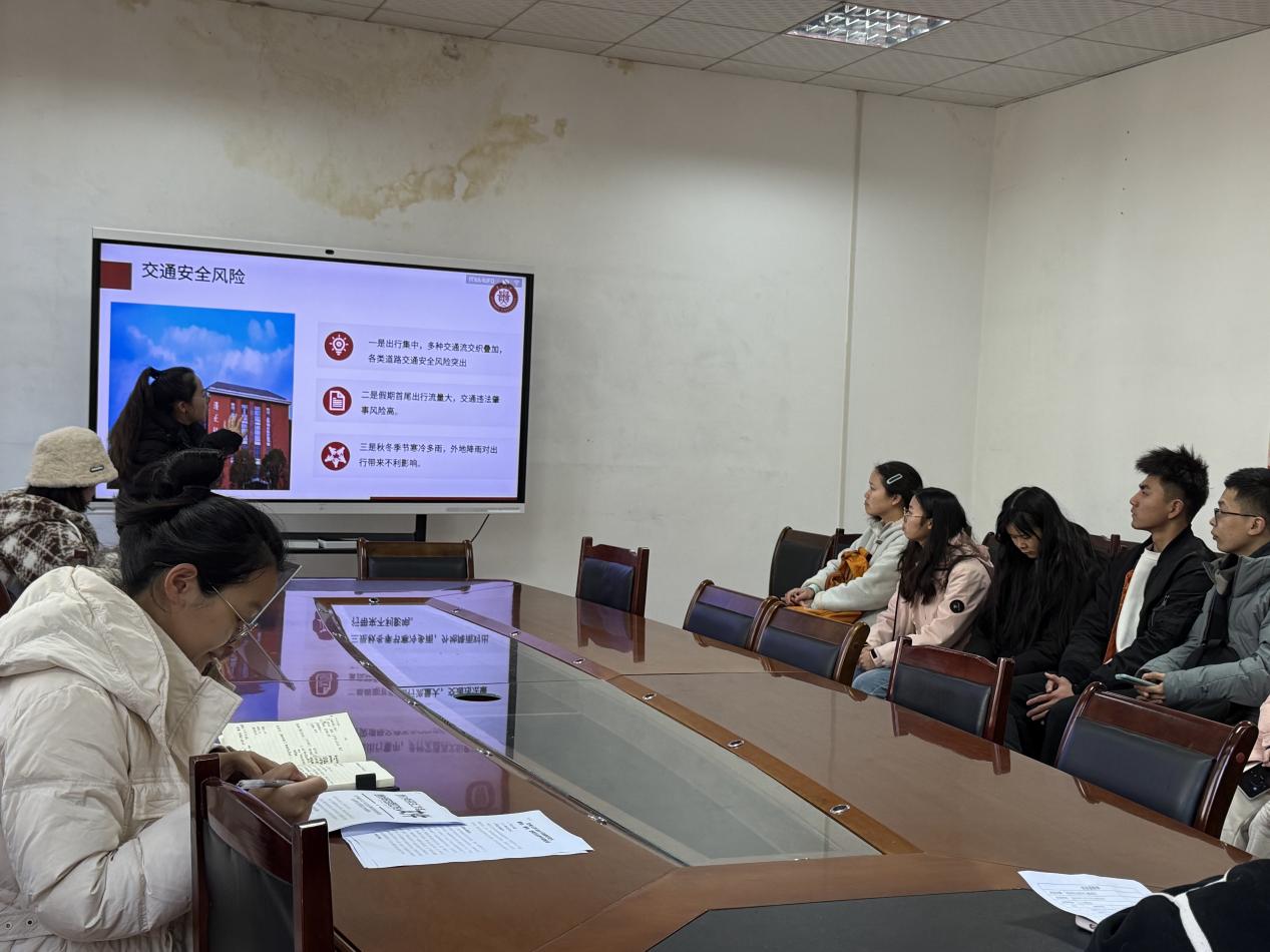 安全教育是校园文化的重要组成部分,不仅关乎个人健康,更是构建和谐校园的基础。为强化校园安全管理,进一步完善校园安全管理措施以及增强同学们的寒假安全意识,确保每位同学都能度过一个平安、愉快的假期,我院于2024年12月31日在人文楼204会议室召寒假安全教育主题会议。研究生会副主席谭海芬主持会议,研究生辅导员罗兰、全体研究生班长参会。