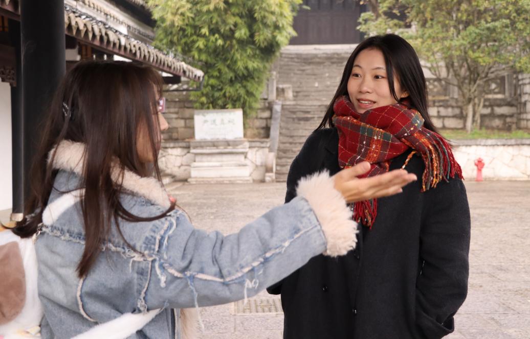 图为知行实践队在阳明祠访问外地游客 实践队员杨欣子怡摄
