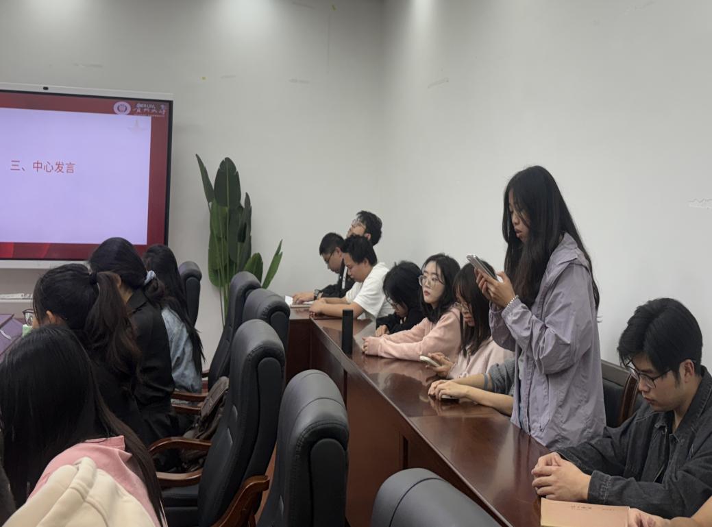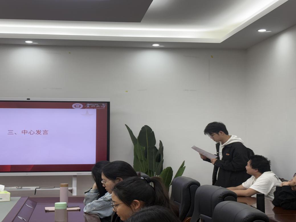 2024级现当代文学专业周密、古代文学专业马子昂、比较文学与世界文学专业朱忠焕进行中心发言。周密说,习近平总书记的贵州之行,既是一份沉甸甸的嘱托,更是一张清晰的时代答卷。在贵州,数字经济与新能源产业的蓬勃兴起、“村超”赛事通过文旅体融合带动县域经济、驻村第一书记带领侗族群众发展民族特色旅游,这些成果告诉我们要打破惯性思维,让创新成为破解发展瓶颈的“金钥匙”。