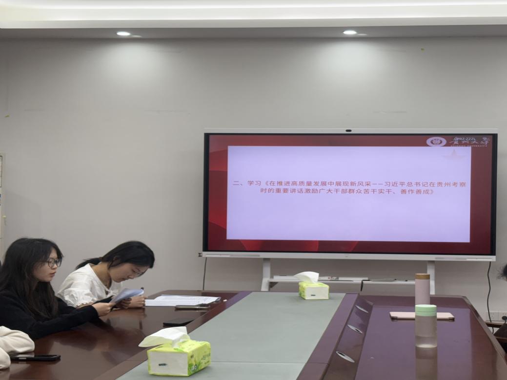 研究生团总支副书记张雯领学《习近平在贵州考察时强调“坚持以高质量发展统揽全局在中国式现代化进程中展现贵州新风采”》,引导广大青年学子深入领会习近平总书记的重要讲话精神,牢记习近平总书记关于高质量发展的殷殷嘱托,坚持矢志不渝跟党走,在实现中华民族伟大复兴的历史征程中贡献新生代力量。